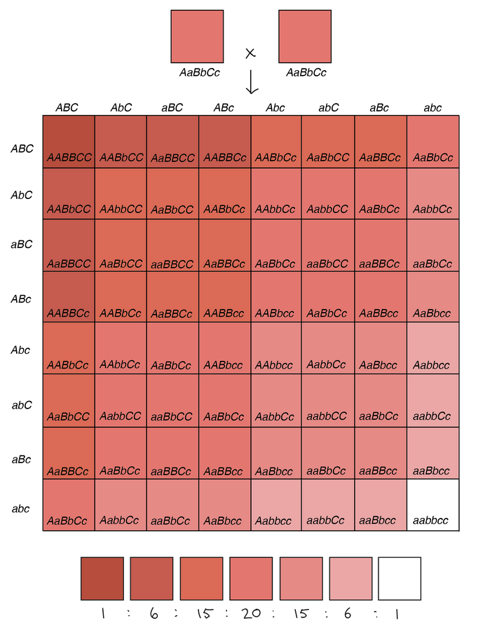 In this example, there are three genes that each make reddish pigment in wheat kernels, which we’ll call A, B, and C. Each comes in two alleles, one of which makes pigment (uppercase) and one of which does not (lowercase). These alleles have additive effects: the aa genotype would contribute no pigment, the Aa genotype would contribute some amount of pigment, and the AA genotype which would contribute more pigment ( twice as much as Aa). The same would hold true for the B and C genes.