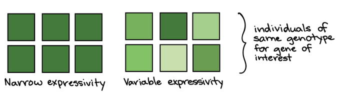 In variable expressivity, a phenotype may be stronger or weaker in different people with the same genotype. For instance, in a group of people with a disease-causing genotype, some might develop a severe form of the disorder, while others might have a milder form.