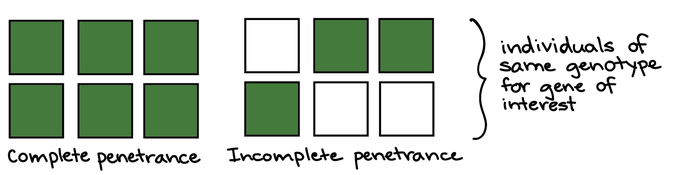 In incomplete penetrance, individuals with a certain genotype may or may not develop a phenotype associated with the genotype. For example, among people with the same disease- causing genotype for a hereditary disorder, some might never actually develop the disorder. The idea of penetrance is illustrated in the diagram below, with green or white color representing the presence or absence of a phenotype.