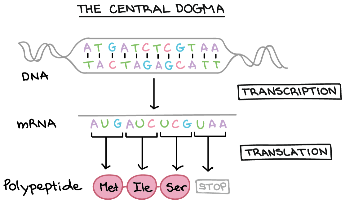 The central dogma of molecular biology is a theory stating that genetic information flows only in one direction, from DNA, to RNA, to protein, or RNA directly to protein.
