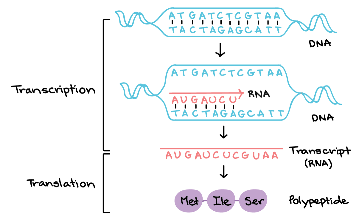 The instructions in a gene (written in the language of DNA nucleotides) are transcribed into a portable gene, called an mRNA transcript. These mRNA transcripts escape the nucleus and travel to the ribosomes, where they deliver their protein assembly instructions. The creation of mRNA transcripts (the creation of these portable genes) is called gene transcription.