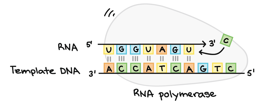 - Elongation. One strand of DNA, the template strand, acts as a template for RNA polymerase. As it “reads” this template one base at a time, the RNA polymerase builds an RNA molecule out of complementary nucleotides, making a chain that grows from 5’ to 3’. The RNA transcript carries the same information as the non-template (coding) strand of DNA, but it contains the base uracil (U) instead of thymine (T).